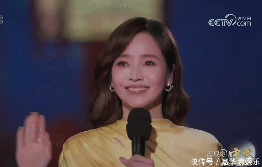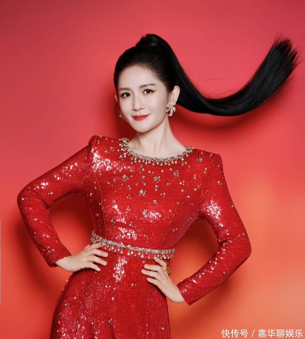 在央视的舞台上,一袭中国红蕾丝长裙,高高挽起的长发,既端庄又大气。